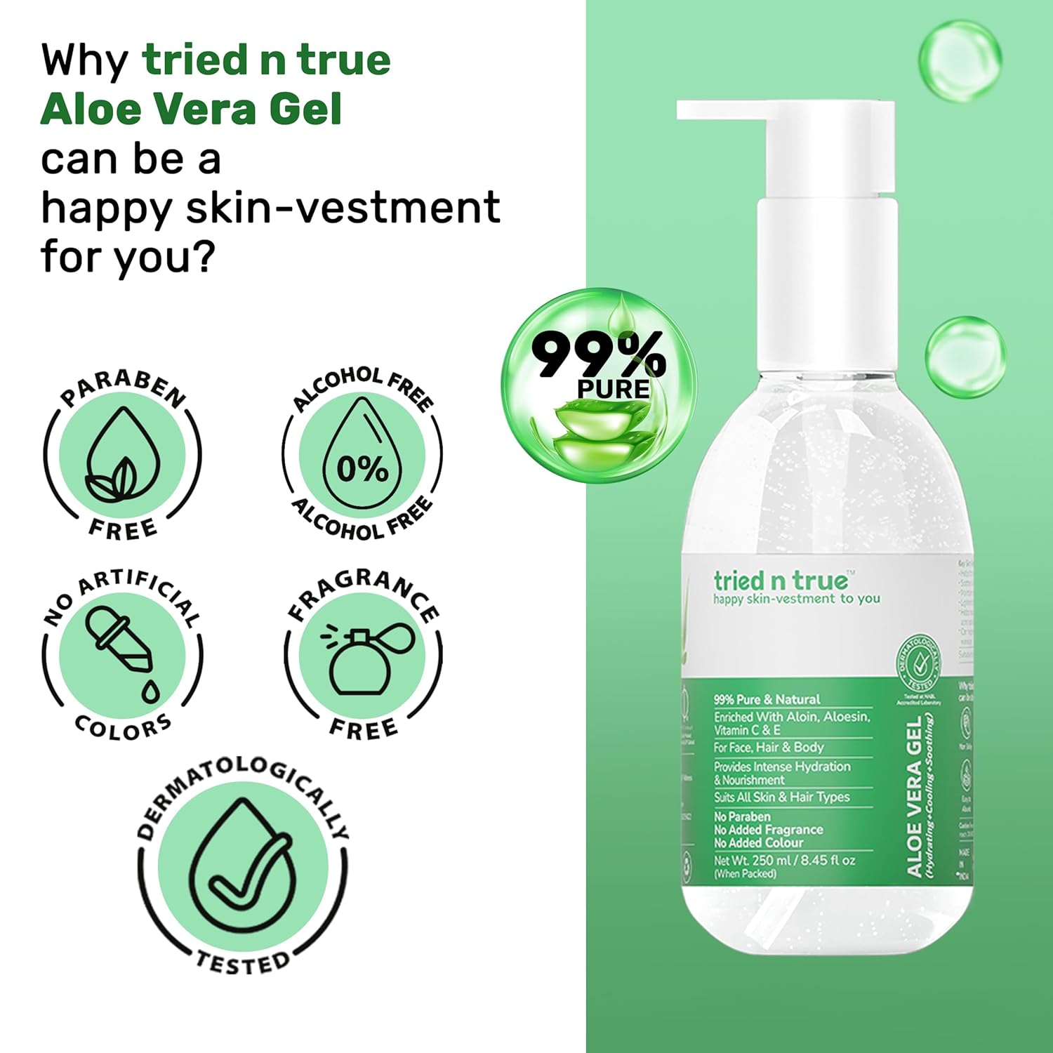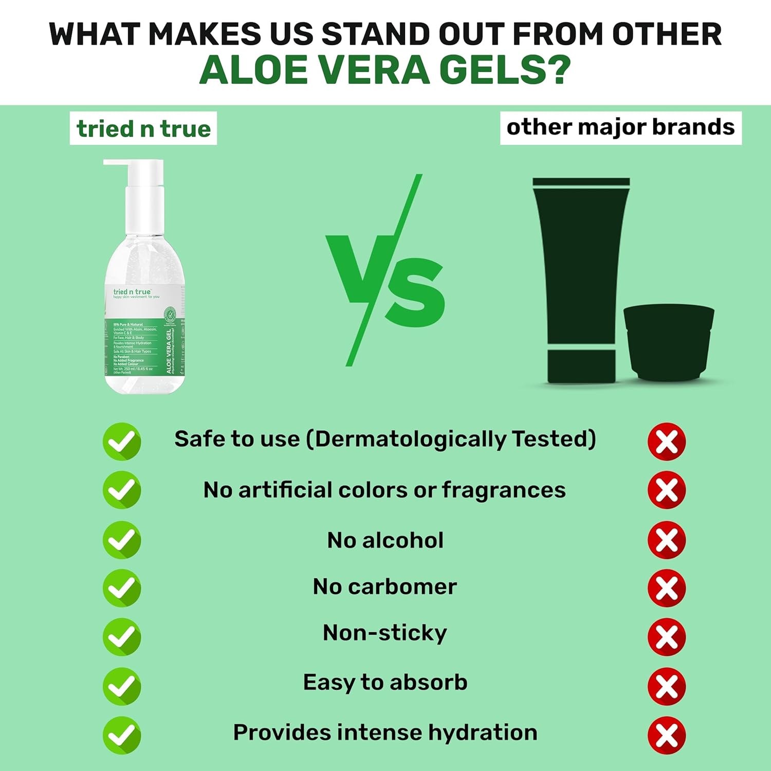 - 99% PURE AND NATURAL: tried n true Pure Aloe Vera Gel is a perfect combination of nature and science as it is made from pure Aloe barbadensis leaf juice which is suitable for all skin types for both men and women.