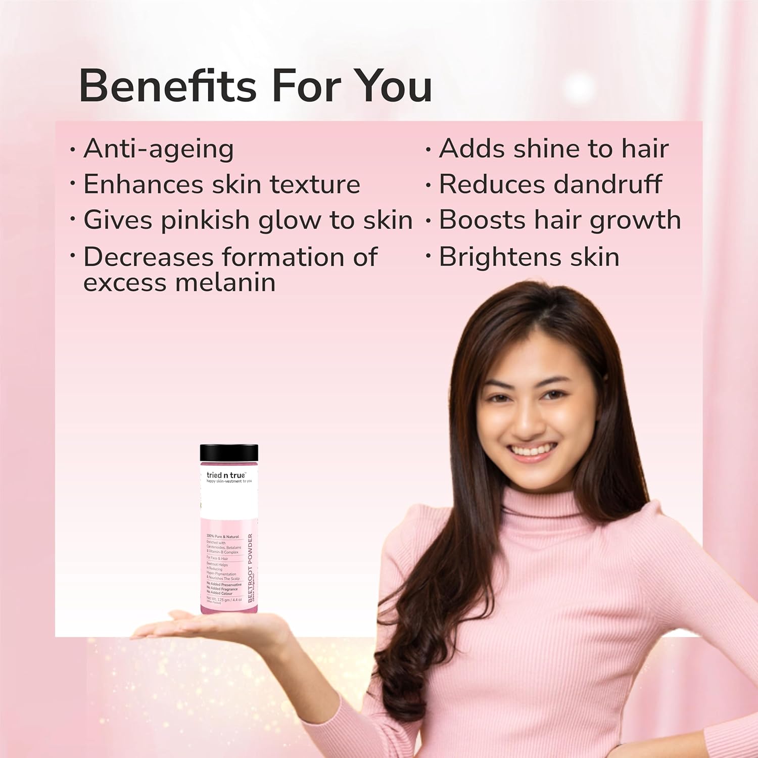 - Decreases formation of excess melanin, reduces hyper-pigmentation, enhances skin texture, gives natural pinkish glow and removes fine lines and wrinkles (anti-ageing)