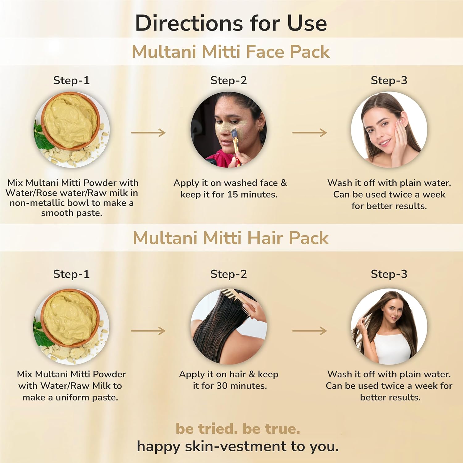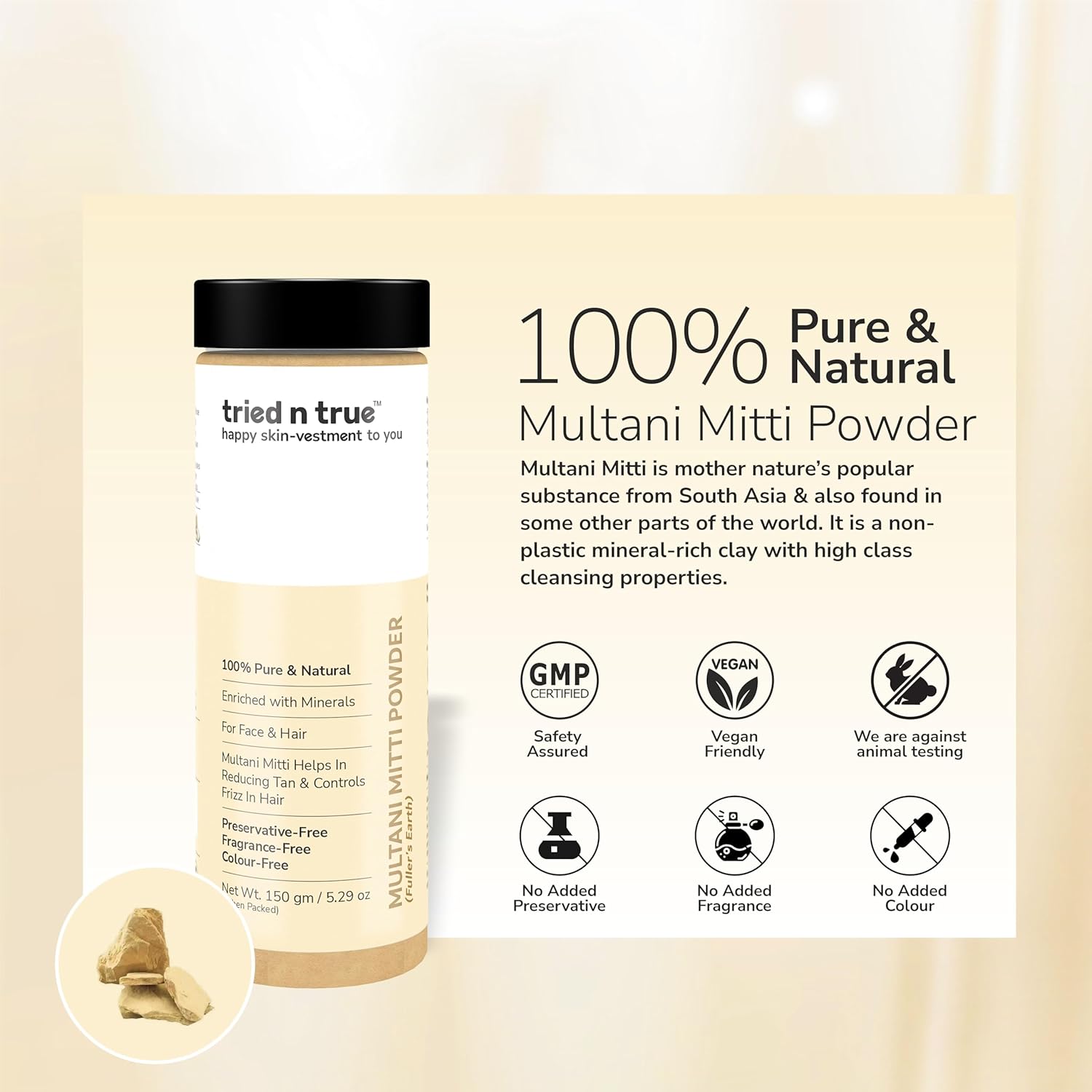 - This product is Vegan and Cruelty-free, since not tested on animals. Hygienically seal-packed in a user-friendly container to ensure that the user is benefitted with pure and natural essence of Multani Mitti Powder