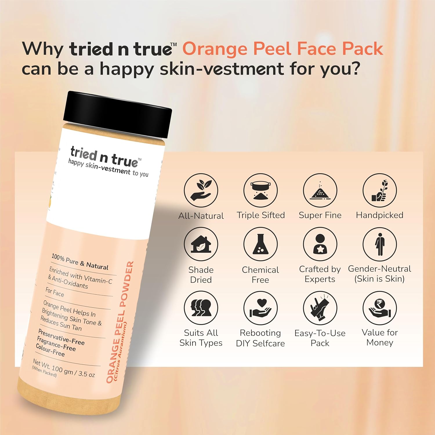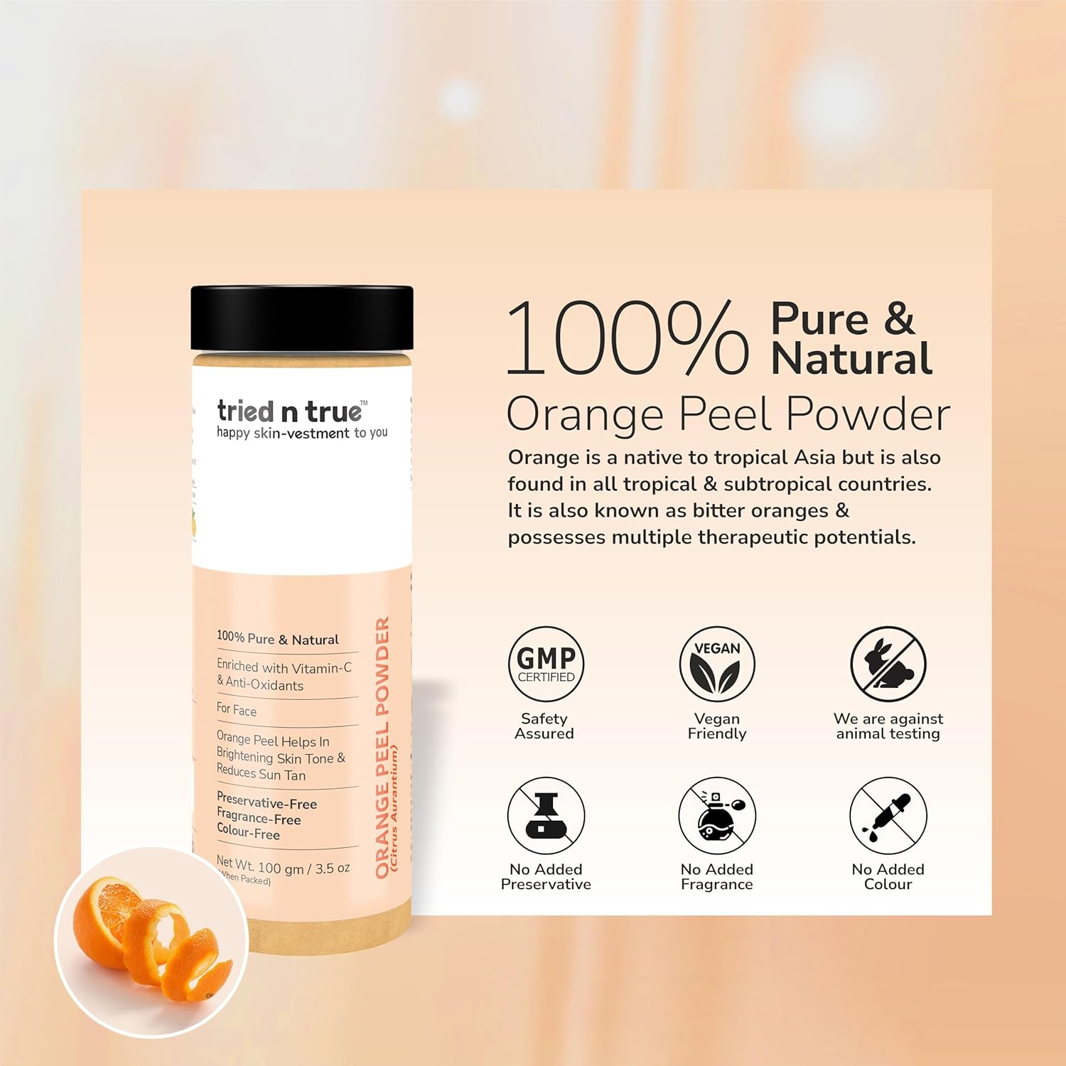 - tried n true Orange Peel Powder is a 100% Pure and Natural Powder. It is derived by subject experts by shade drying pure orange peels to sustain its natural values, processed and packed under stringent quality standards