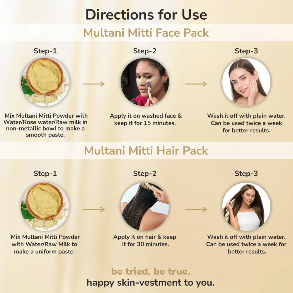 - These 2 packs when used in combination work magically on skin to reduce blemishes, dark spots and sun tan. Also help in balancing skin oil and purifying pores. Multani mitti when used individually on hair, cleanses and conditions hair, reduces frizz in hair as well as purifies scalp