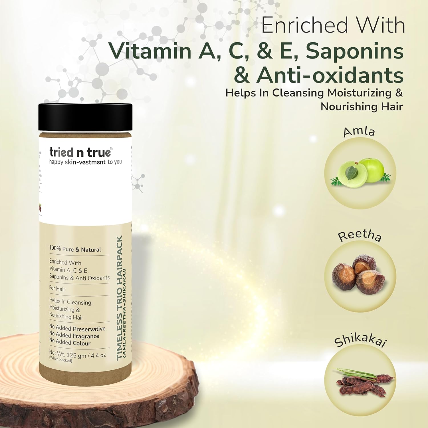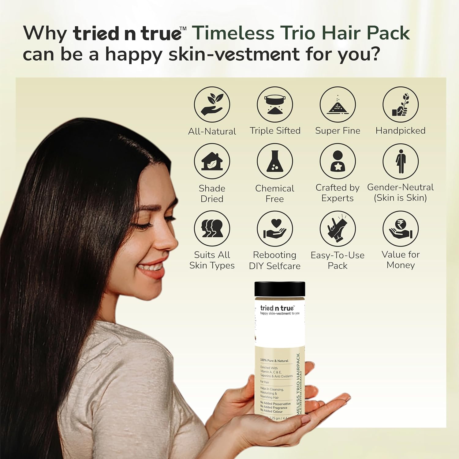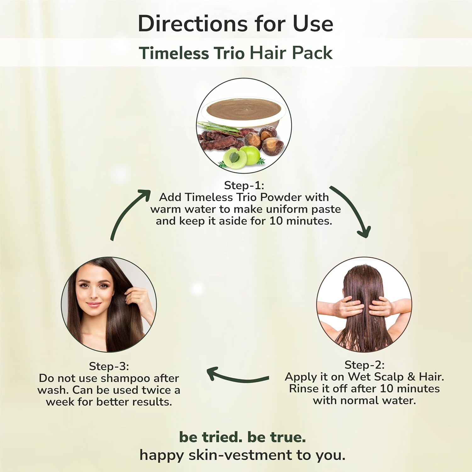 - tried n true Timeless Trio Hair Pack is a 100% Pure and Natural Powder, which acts as a natural shampoo and conditioner